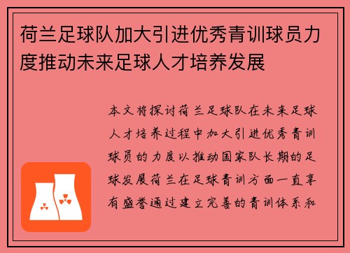 荷兰足球队加大引进优秀青训球员力度推动未来足球人才培养发展