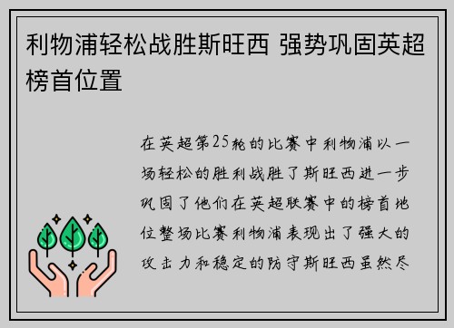 在英超第25轮的比赛中,利物浦以一场轻松的胜利战胜了斯旺西,进一步巩固了他们在英超联赛中的榜首地位。整场比赛,利物浦表现出了强大的攻击力和稳定的防守,斯旺西虽然尽全力抗争,但始终未能突破利物浦的防线。通过这场胜利,利物浦不仅保持了积分榜上的领先位置,还展示了球队在关键时刻的高水平发挥。本文将从四个方...