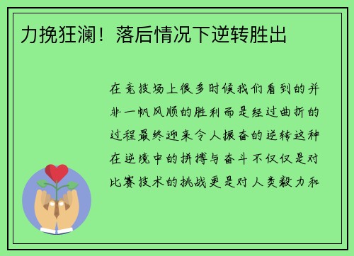 在竞技场上,很多时候我们看到的并非一帆风顺的胜利,而是经过曲折的过程,最终迎来令人振奋的逆转。这种在逆境中的拼搏与奋斗,不仅仅是对比赛技术的挑战,更是对人类毅力和精神的考验。在那些艰难时刻,真正能够逆转的,不仅仅是手中的球或者赛场上的比分,更是每一个战士心中的坚持与信念。
