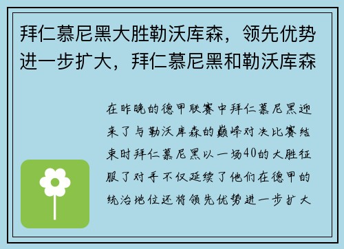 拜仁慕尼黑大胜勒沃库森,领先优势进一步扩大,拜仁慕尼黑和勒沃库森