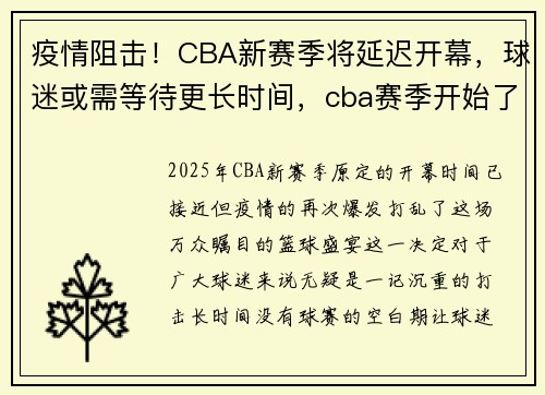2025年,CBA新赛季原定的开幕时间已接近,但疫情的再次爆发打乱了这场万众瞩目的篮球盛宴。这一决定对于广大球迷来说无疑是一记沉重的打击。长时间没有球赛的空白期,让球迷们的热情陷入了前所未有的低谷,而疫情的蔓延更是将这一切的不确定性推向了极致。CBA新赛季的开幕延期,似乎已经成为了不可避免的现实。