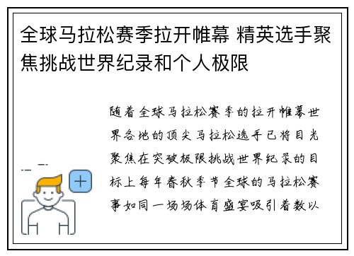 随着全球马拉松赛季的拉开帷幕,世界各地的顶尖马拉松选手已将目光聚焦在突破极限、挑战世界纪录的目标上。每年春秋季节,全球的马拉松赛事如同一场场体育盛宴,吸引着数以万计的跑者参与,其中不乏精英选手,他们不断挑战自己、突破极限,追求更快的成绩、更高的荣誉。马拉松作为一项长时间的极限耐力运动,不仅需要运动员...
