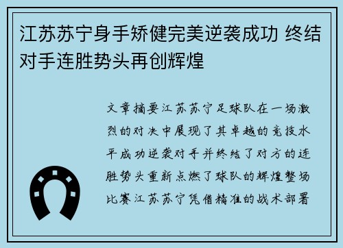 文章摘要:江苏苏宁足球队在一场激烈的对决中展现了其卓越的竞技水平,成功逆袭对手,并终结了对方的连胜势头,重新点燃了球队的辉煌。整场比赛,江苏苏宁凭借精准的战术部署、球员的高效执行力以及坚定的团队合作精神,完成了精彩的逆转,令球迷和媒体为之震撼。这场胜利不仅是球队实力的体现,也是其顽强拼搏精神的最佳诠...